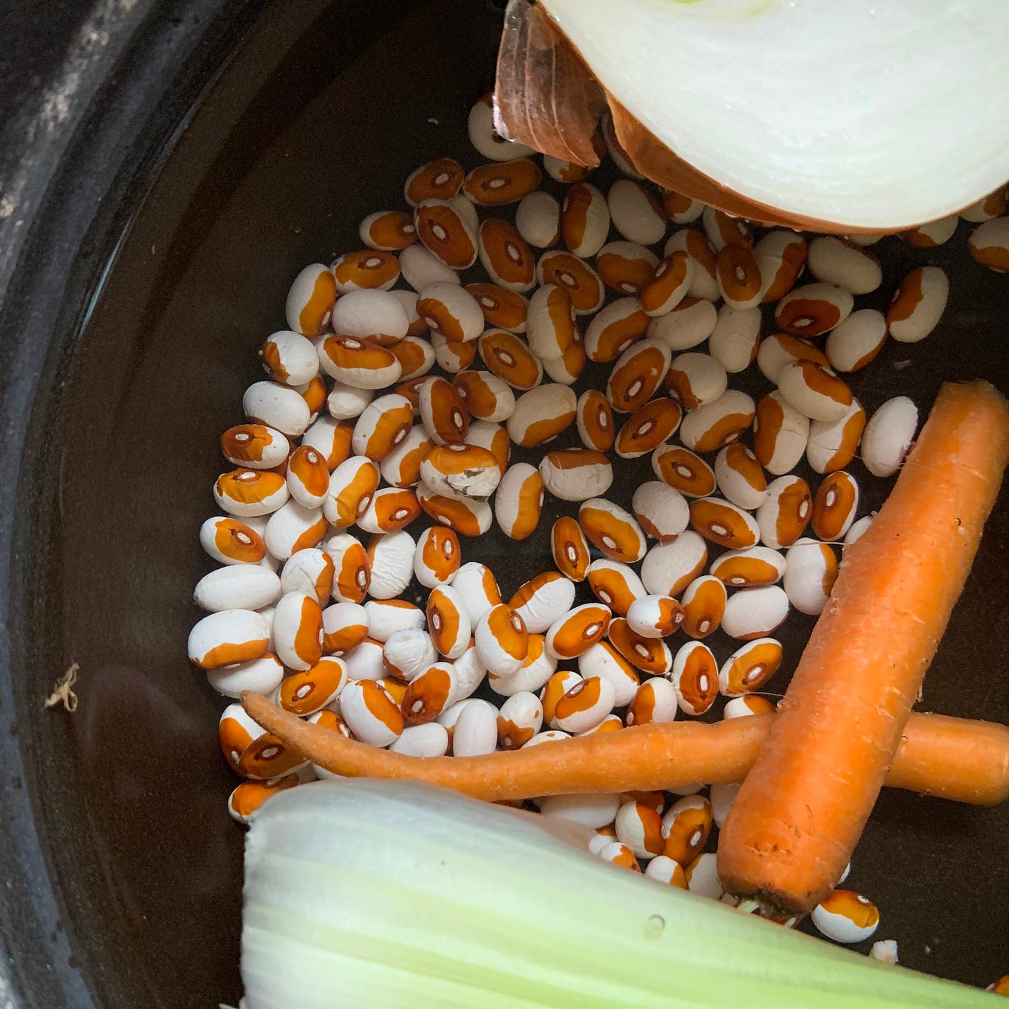 I like to add whatever I have on hand to give my beans a little more depth up front. For a whole pound of dried beans, I'll add all or some combination of these aromatics:
